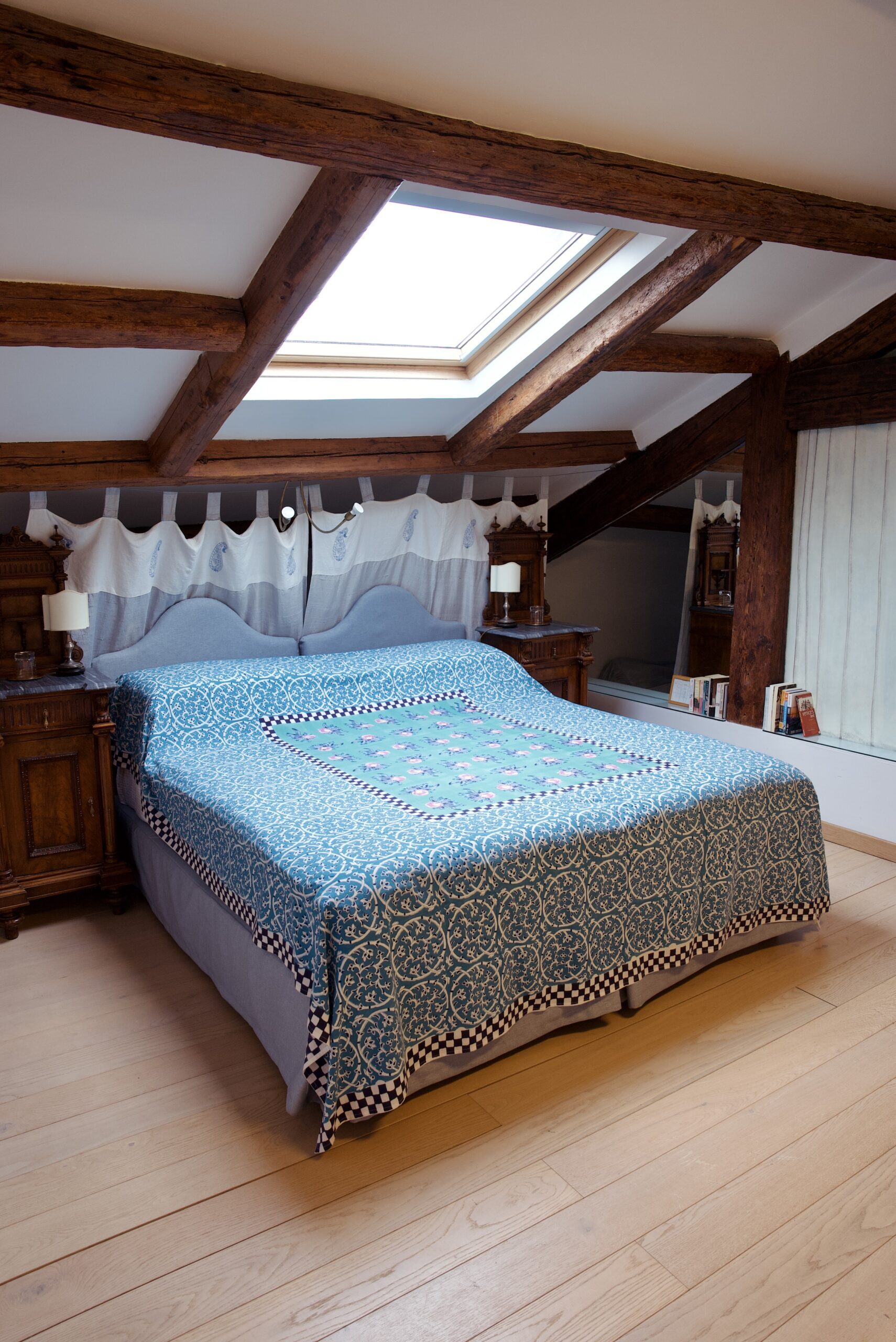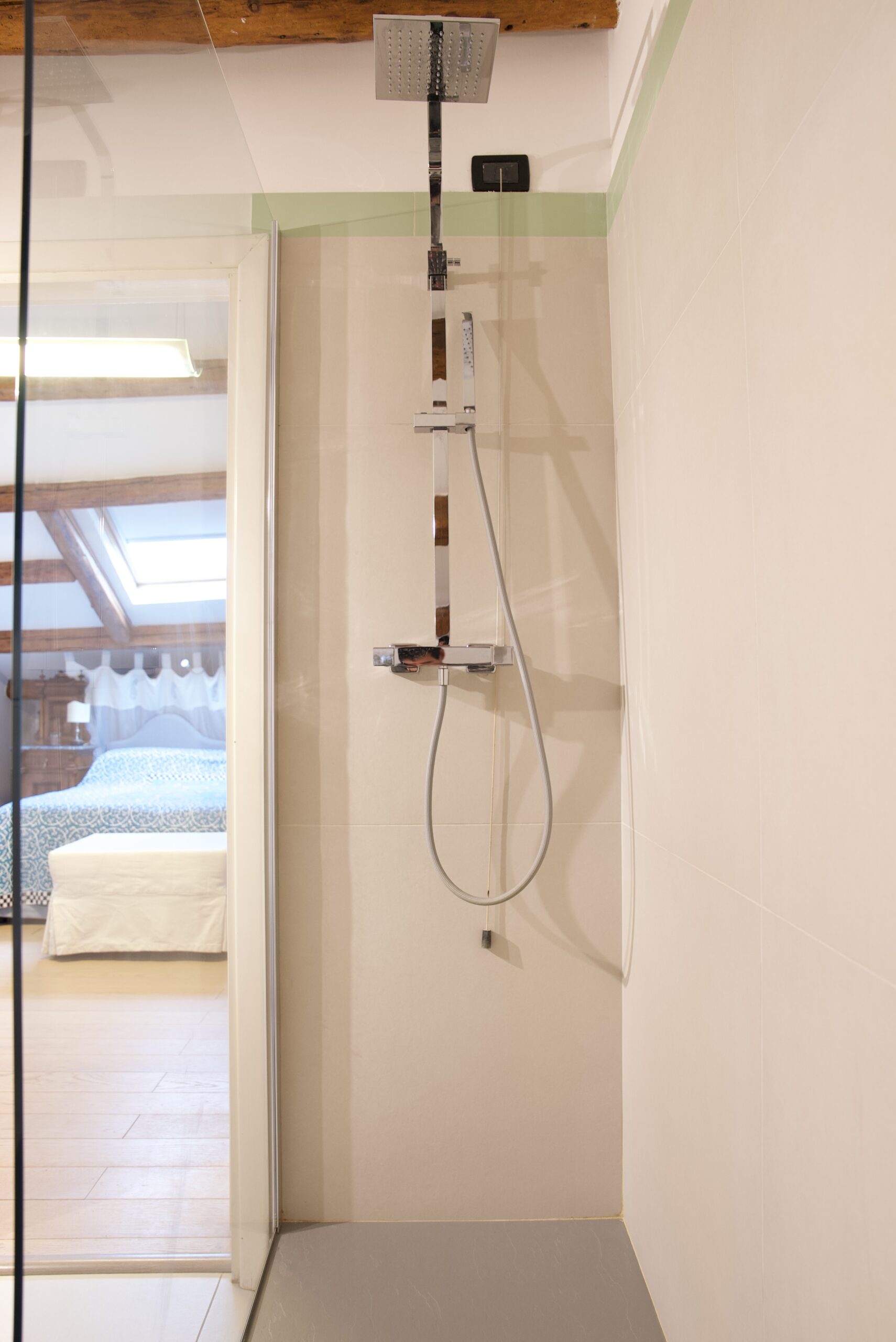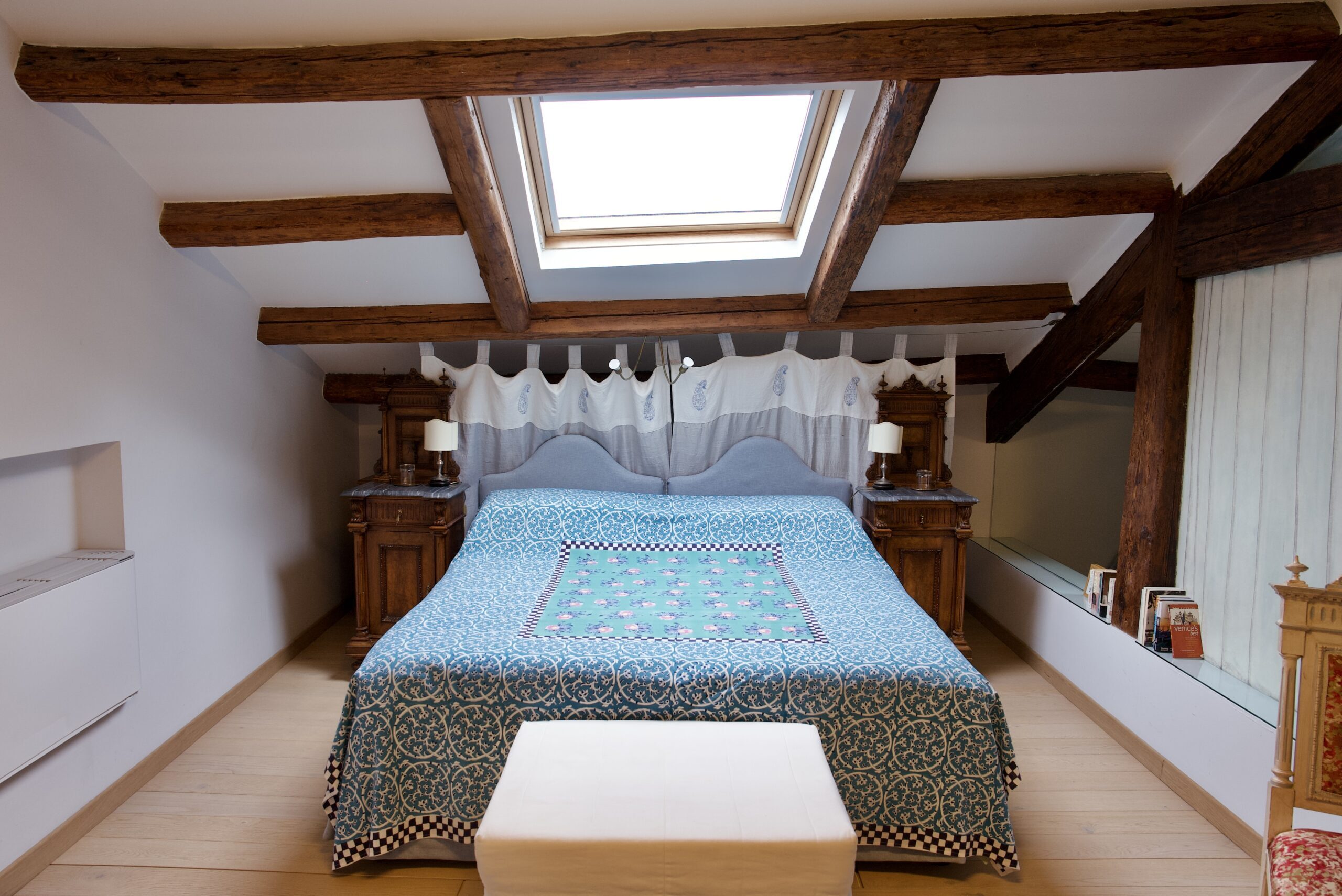 Una deliziosa mansarda sui tetti di Venezia arricchita da una bella copia in affresco de “Il Mondo nuovo” di Tiepolo.