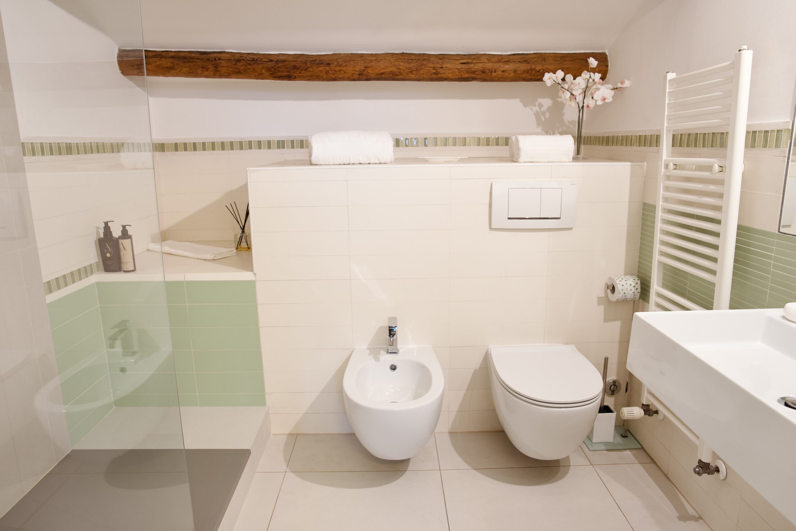 Il pavimento in nuovo parquet naturale con certificazione green; la stanza è dotata di un ampio e spazioso bagno con vasca in tinte chiare.